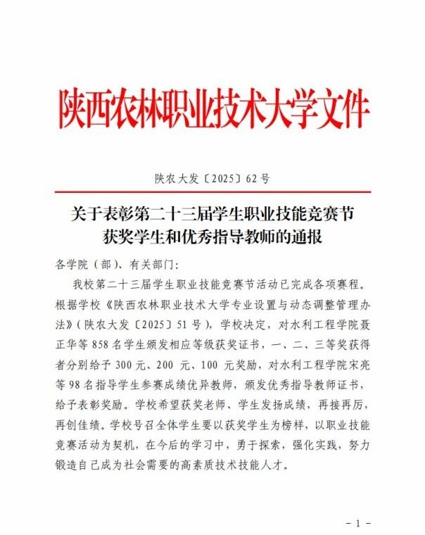 2025年12月25日,陕西农林职业技术大学发布《关于表彰第二十三届学生职业技能竞赛节获奖学生和优秀指导教师的通报》。我院董昊等56名学生以及杨静冰等5名指导教师获得学校表彰。