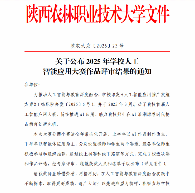 2026年3月19日,学校人工智能应用大赛作品评审结果正式公布,我院师生在赛事中表现优异,斩获颇丰。其中教师组在应用作品、智能体开发应用两大赛道累计获一等奖3项、二等奖2项、三等奖4项;学生组同步斩获一等奖1项、二等奖2项、三等奖3项。