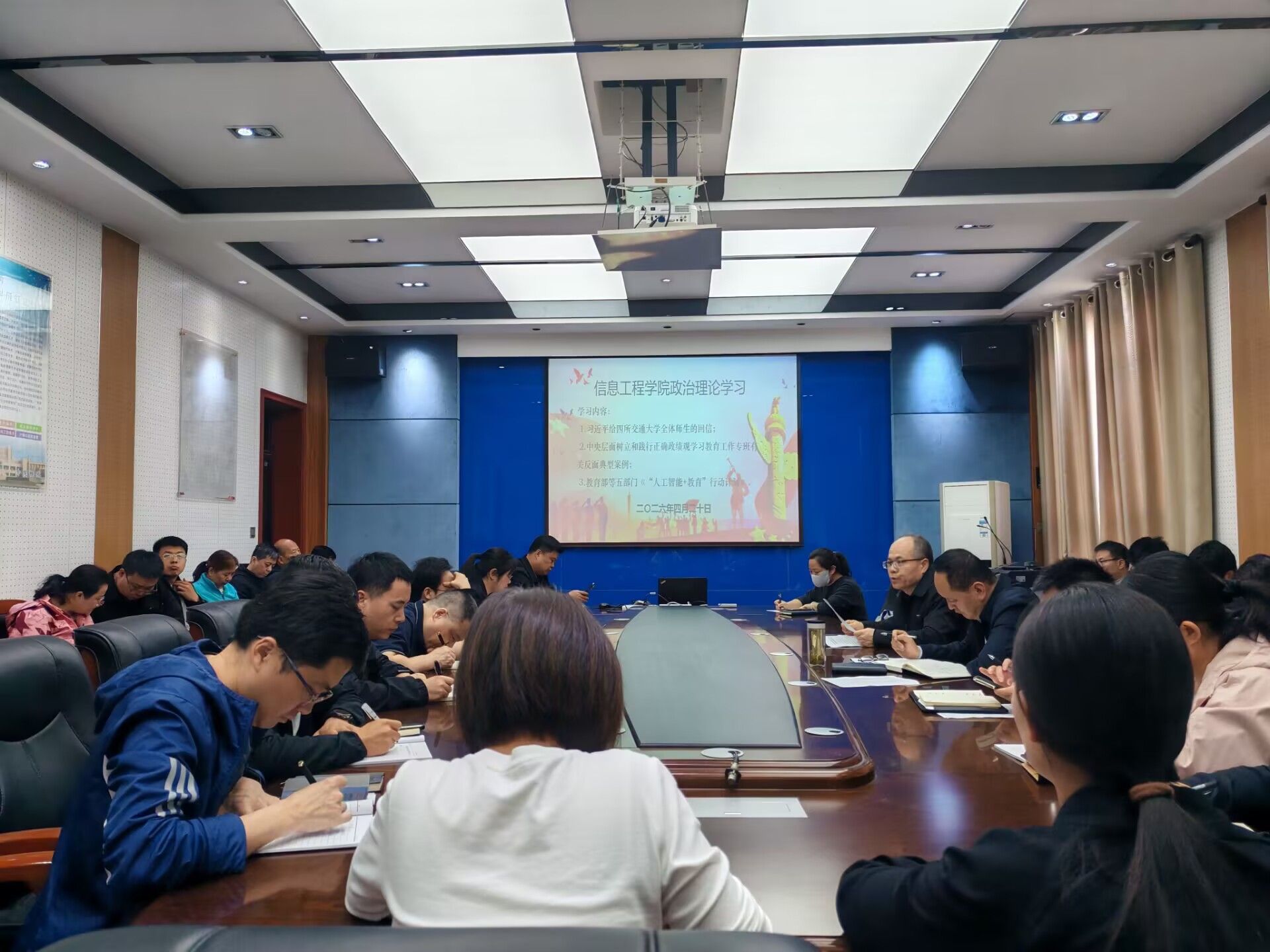 党总支书记吴高潮带领大家深入学习了《习近平给四所交通大学全体师生的回信》《中央层面树立和践行正确政绩观学习教育工作专班有关反面典型案例》;院长陈高锋带领大家学习了教育部等五部门《“人工智能+教育”行动计划》。
