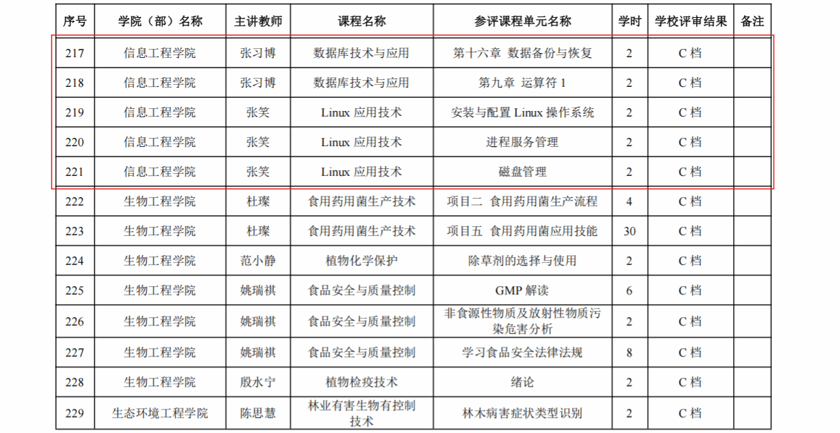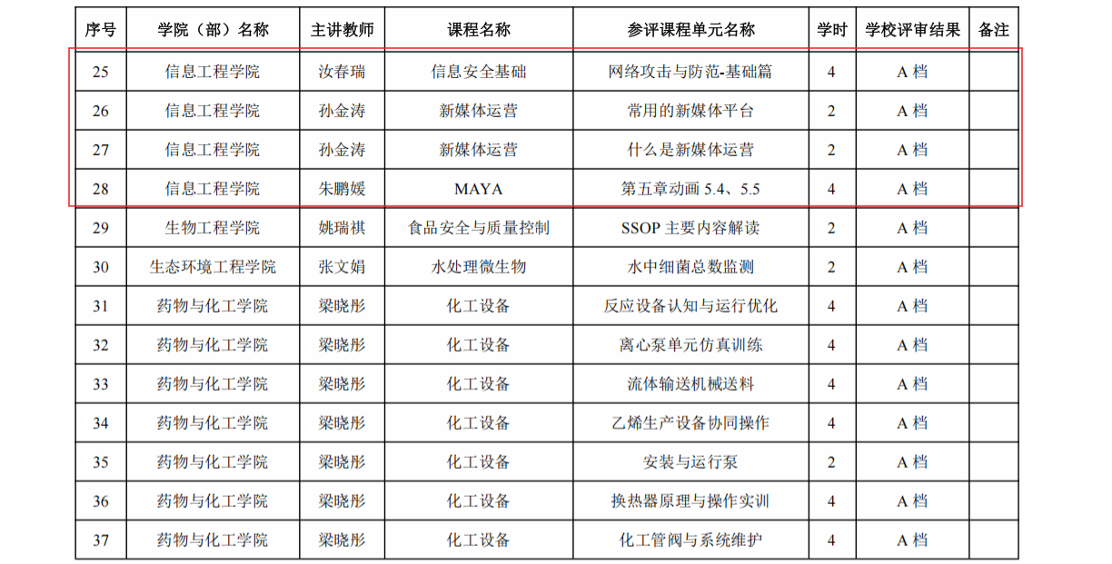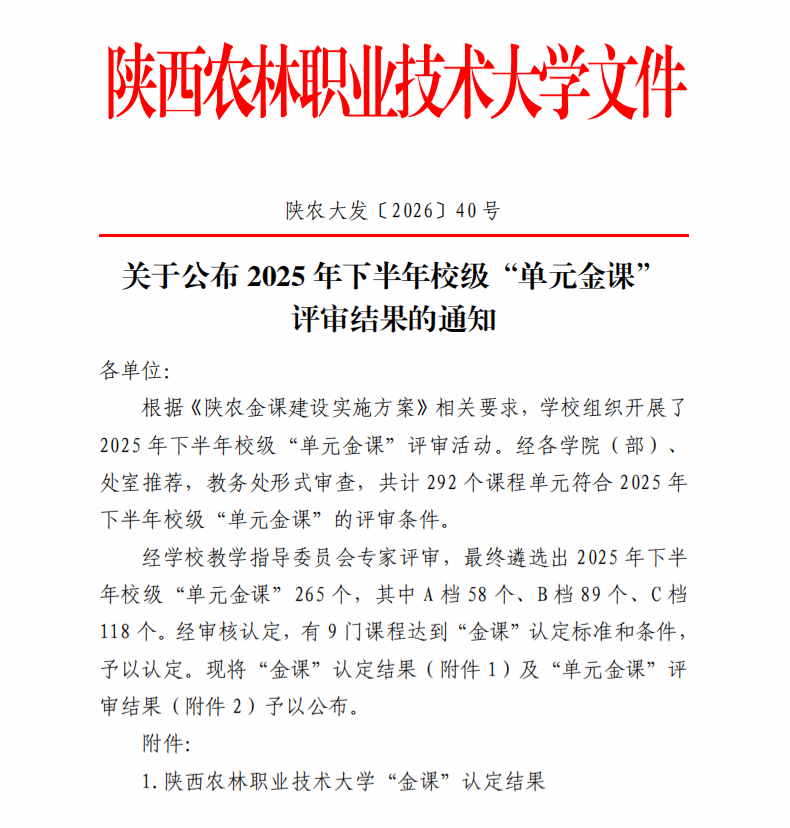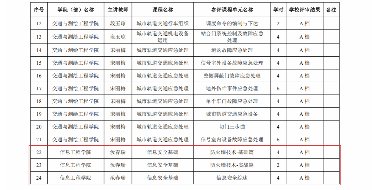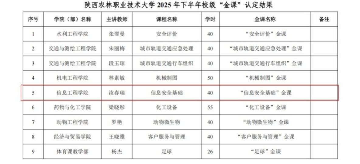 4月20日,陕西农林职业技术大学2025年下半年校级“单元金课” 评审结果公布,我院教师汝春瑞主讲的《信息安全基础》课程获得校级“金课”认定。本次共有65个“单元金课”评审通过,其中A档7个,B档13个,C档27个,共计140个学时。