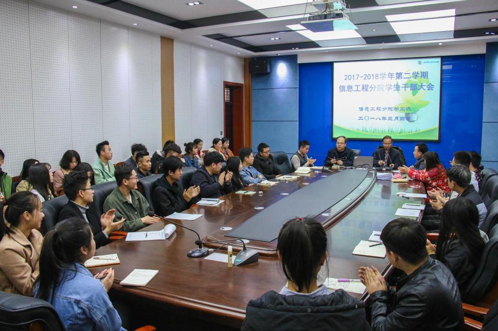 2018年3月4日上午10点,信息工程分院在南校区秦风楼会议室召开了2017-2018学年第二学期学生干部大会。信息工程分院党总支书记高掌平,学工办主任吴高潮、全体辅导员出席了会议。信息工程分院全体学生干部参加了本次大会。