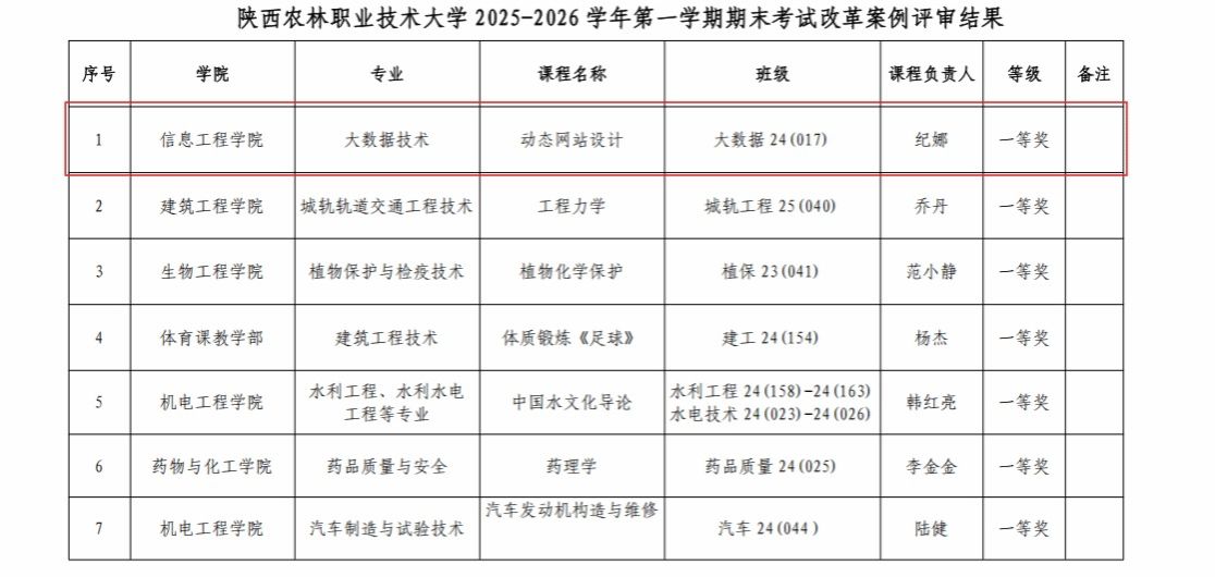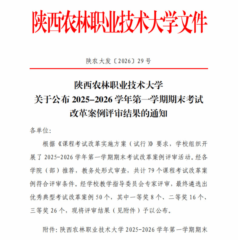 2026年4月3日,陕西农林职业技术大学2025-2026学年第一学期期末考试改革案例评审结果正式公布。经各学院推荐、学校教务处形式审查及校教学指导委员会专家严格评审,我院荣获一等奖1项、二等奖4项、三等奖4项,充分展现了我院在教育教学改革领域的扎实工作成效和显著创新成果。