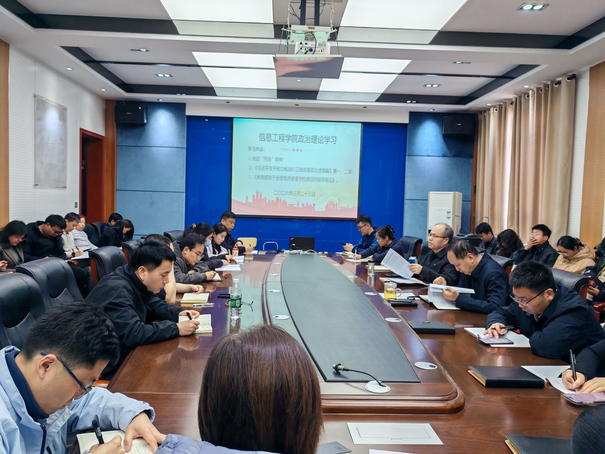 按照学院党总支政治理论学习计划安排,3月23日下午,信息工程学院党总支组织全体教职工在秦风楼四楼会议室开展政治理论集中学习。