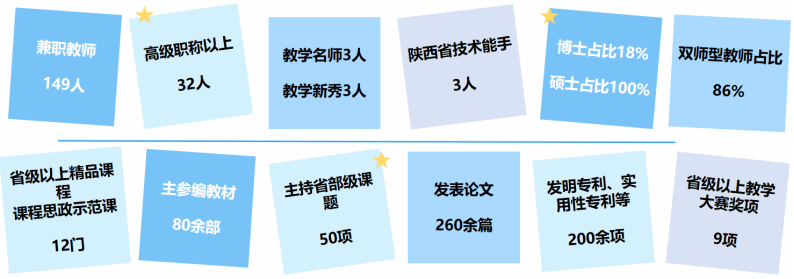 师资力量雄厚。学院拥有一支具有坚实的理论基础和丰富实践经验及较高创新能力的高水平教师队伍;现有专兼职教师149人,高级职称以上32人,教学名师3人,教学新秀3人,陕西省技术能手3人,专任教师博士研究生占比18%,硕士研究生占比100%,双师型教师占比86%,高级职称占比48%。教师团队主持参与省级以上精品课程、课程思政示范课、一流核心课等12门,主参编教材80余部,主持省部级课题50余项,发表论文260余篇,获得发明专利、实用新型专利和软件著作权等200余项,教师参加“教学能力大赛”、“高校教职工AI创新应用大赛”等获得省级以上奖项9项。